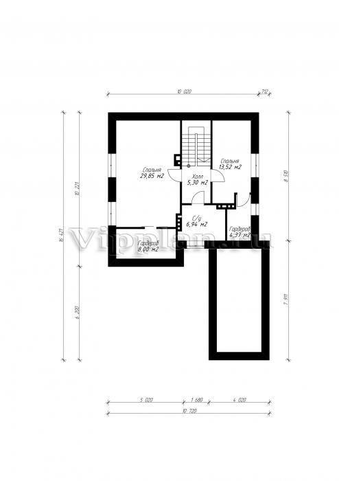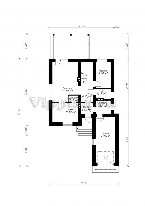 Проект индивидуального одноэтажного жилого дома с мансардой с размерами 10,72 x 16,42 м.